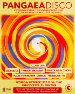 Pangaea Disco are back on Sat Oct 21st for a very special one-off event in the heart of Brixton, our unofficial home.Come and join us for a generous dose of the signature Pangaea sounds of global funk, disco, afro, house and more…Joining us behind the decks on the night are co-founders Theon Bower and Donzai as well as South London’s newcomers Chon& Fred going B2B. Special guest to be announced soon too... --- Strictly 18+. Scannable & Physical Photo I.D is…
