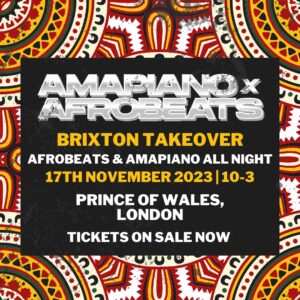 Amapiano X Afrobeats Party (London) Join us as we are bringing Ama-Vibes to Brixton this November! Expect to hear the best of Amapiano sounds mixed with all your favourite Afrobeats bangers all night. Expect strictly Afrobeats and Amapiano vibes with special guest and resident DJs playing the likes of Burna Boy / Wizkid / Asake / Tiwa Savage / Timaya / Davido / Yemi Alade / Fireboy DML / P-Square / Busta 929 / Olamide / Mista Silva / R2Bees…