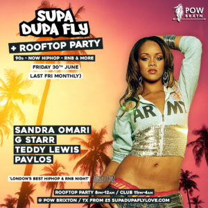 Last Friday's monthly, Rooftop kicks off from 8pm... ‘London’s best RnB & Hiphop Nights’ Time Out, Evening Standard Dj’s Sandra Omari (BBC 1Xtra mix Dj), G-Starr, Pavlos, Teddy Lewis. Hosted by Teddy. ___________________________________ Supa Dupa Fly has become the necessity in many ’90s, ’00s & now hip-hop, R&B lovers diaries, selling out every weekly event and becoming unquestionably the biggest event of its kind in the UK for the past 10 years. Supa Dupa Fly have hosted shows for artists…